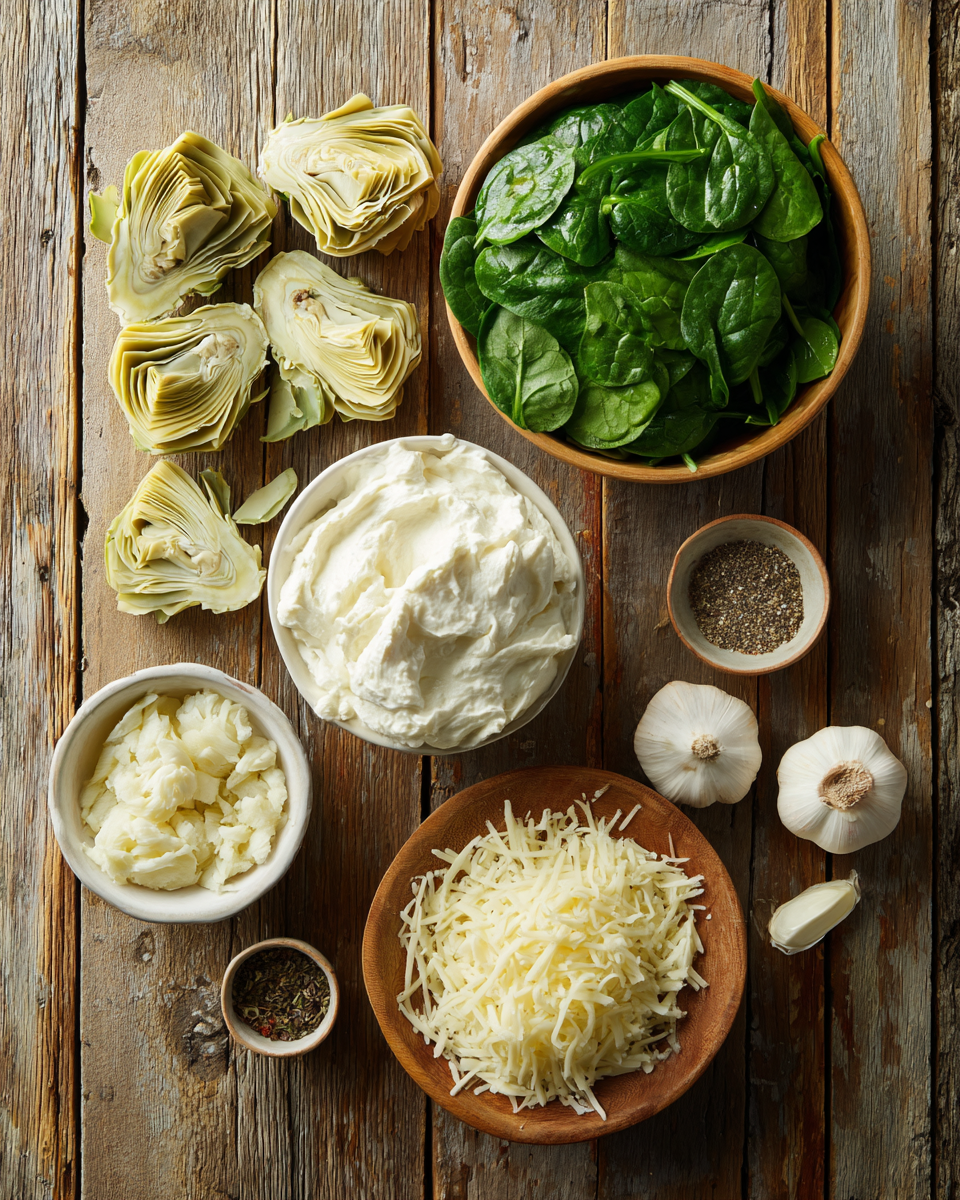 - In a bowl, mix spinach, artichoke hearts, cream cheese, Parmesan, mozzarella, garlic, pepper, and salt.